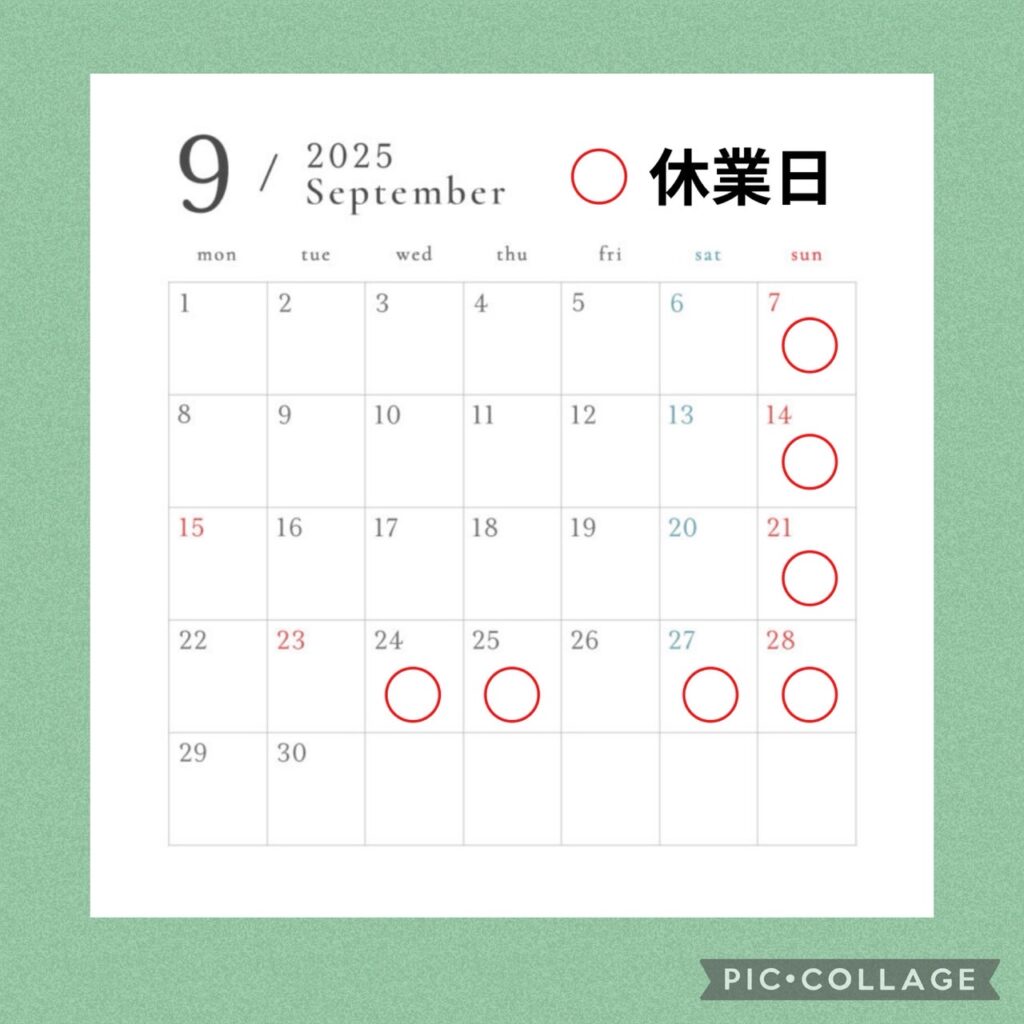 2025年9月の営業情報ですが、24、25、27日が諸用のため休業となります。