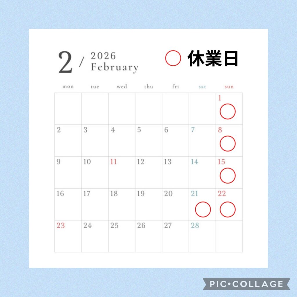 2026年の2月は21日土曜日がお休みとなります。また毎週日曜日はお休みを頂いております。