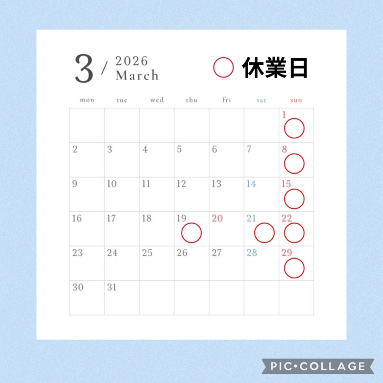 2026年3月の休業情報ですが、19日、21日は社外への出張があるためお休みです。