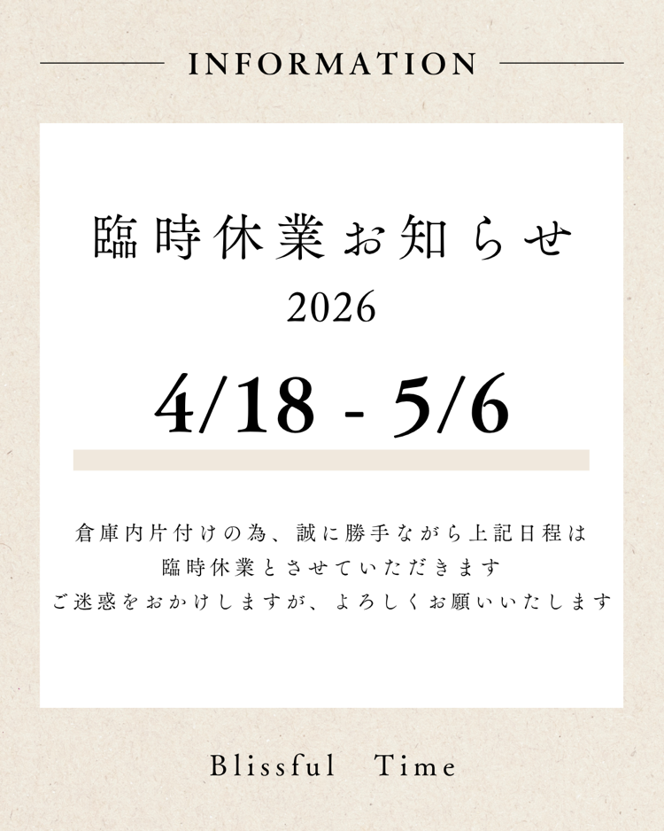 2026年4月18日から5月6日の間、倉庫内片付けのため、誠に勝手ながら臨時休業とさせていただきます。